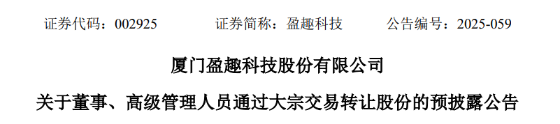 盈趣科技9日晚间的公告显示,公司董事、总裁杨明和财务总监、董事会秘书李金苗,计划在2025年7月2日至2025年10月1日期间,通过大宗交易转让合计不超91万股至双方配偶。