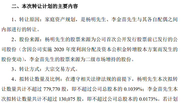 公告介绍,转让原因系家庭资产规划,是杨明、李金苗与其各自配偶之间内部进行的转让。股份来源方面,杨明的股票来源为公司首次公开发行股票前已发行的公司股份,李金苗的股票来源为二级市场增持的股份。转让方式为大宗交易方式。转让价格根据转让时的二级市场价格确定。本次转让计划的实施不会导致公司控制权发生变更,也不会对公司治理结构及持续经营产生重大影响。